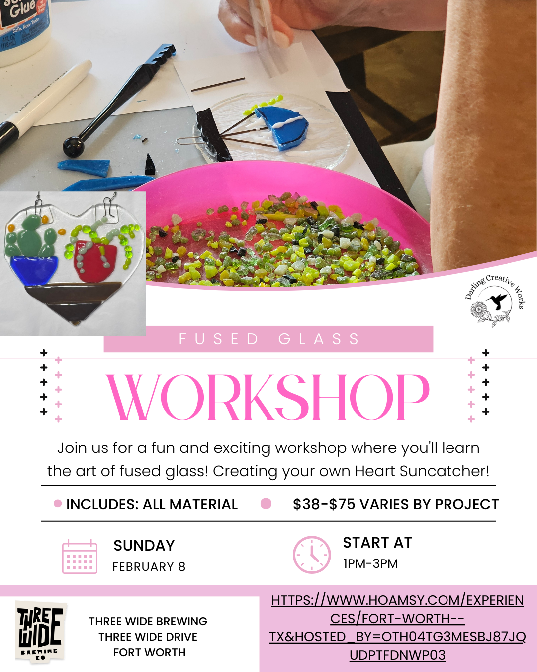 On February 8th from 1–3PM, join us at Three Wide Brewing Co for a fun fused glass workshop where you’ll design your very own Heart Shaped Suncatcher.