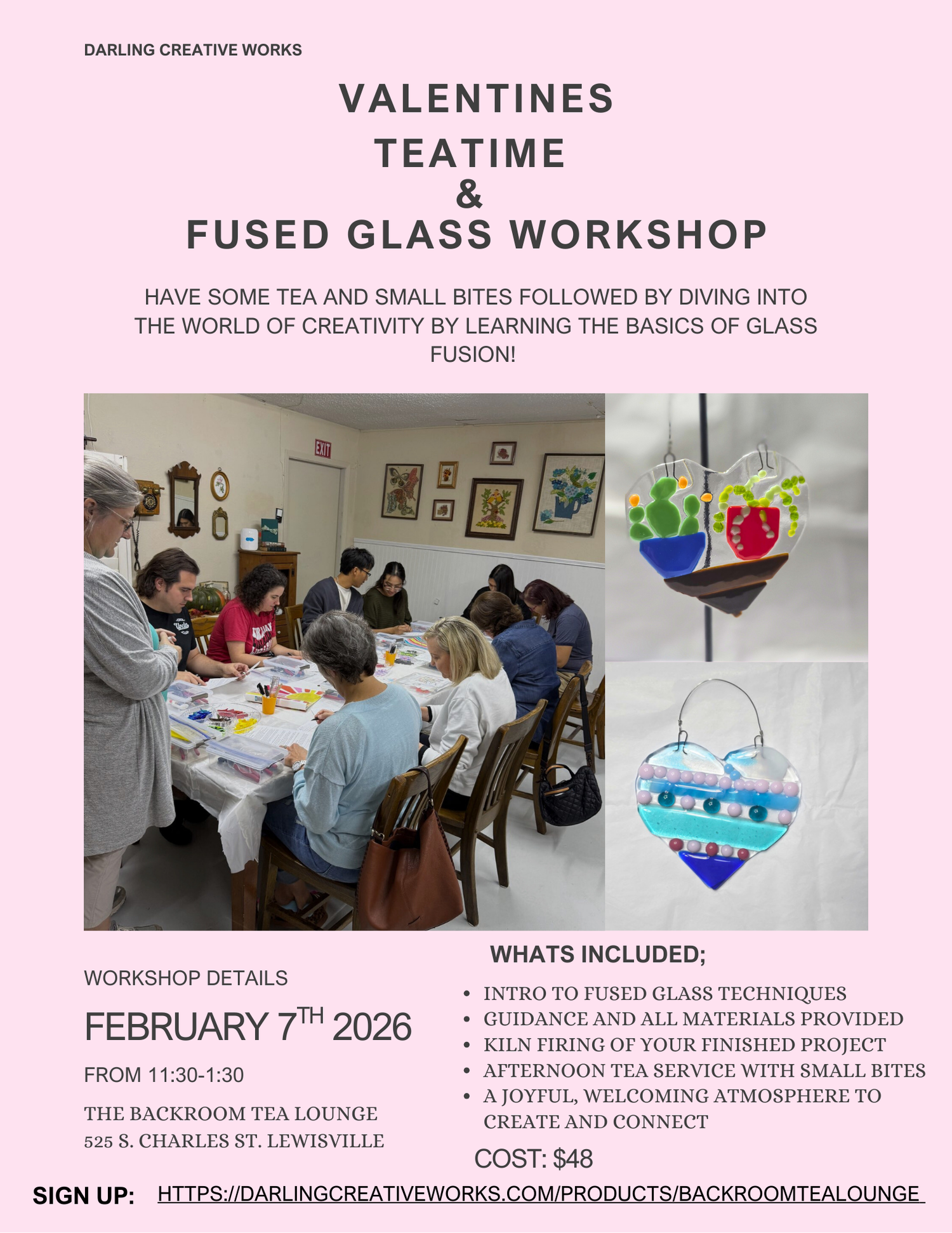 Celebrate the season of love with a cozy creative escape! Join us for a heart-filled afternoon of fused glass art, tea, and connection at The Backroom Tea Lounge in Lewisville.