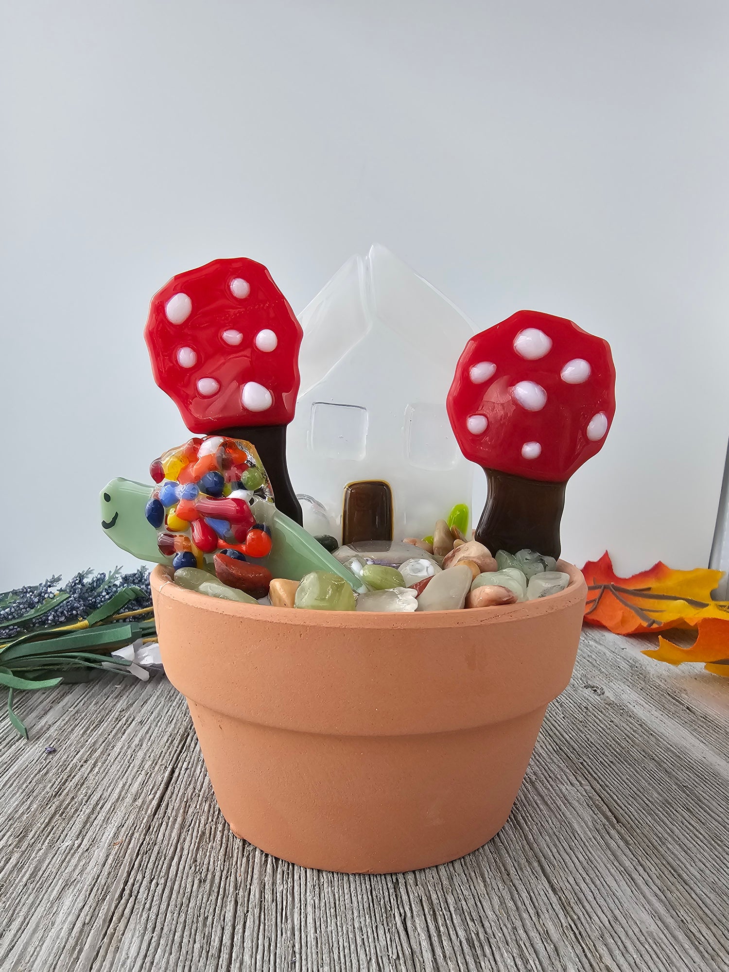 - The Free Spirit Way: Place your pot in a bowl to catch any runaway stones. Pour the stones over the glue-covered pot, letting them settle into place. Then, press your fused glass pieces gently into the glue wherever your heart desires. Add more stones and glue as needed and let it all dry. Pro tip: The glue dries clear, so don’t worry about the mess—it’s all part of the magic.
