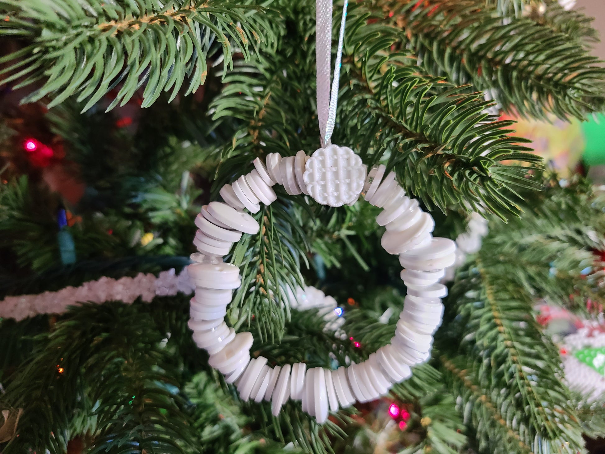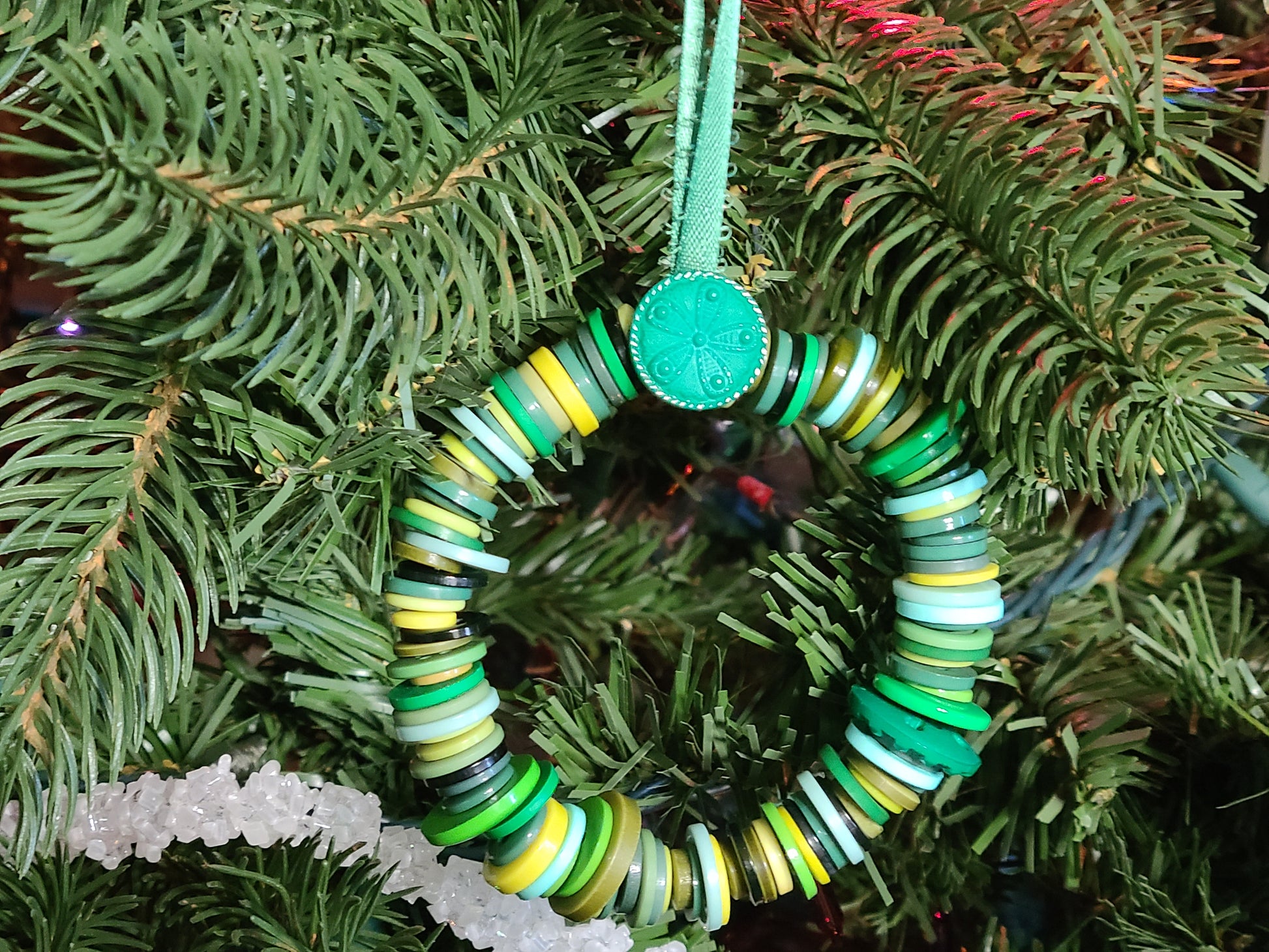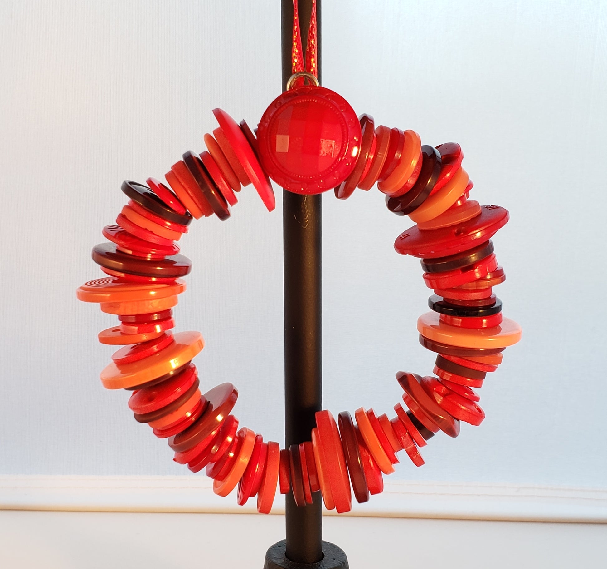 One Christmas wreath made from buttons; the buttons are various shades of colors. The buttons are strung on wire topped with a wire loop and wrapped with a corresponding ribbon color; some have a button top instead of a ribbon bow. No two wreaths are the same, you choose the colorway and get a random wreath in those colors. The Christmas button wreath is approximately 3.5 to 4 in. tall and 3.5 to 4 in wide.