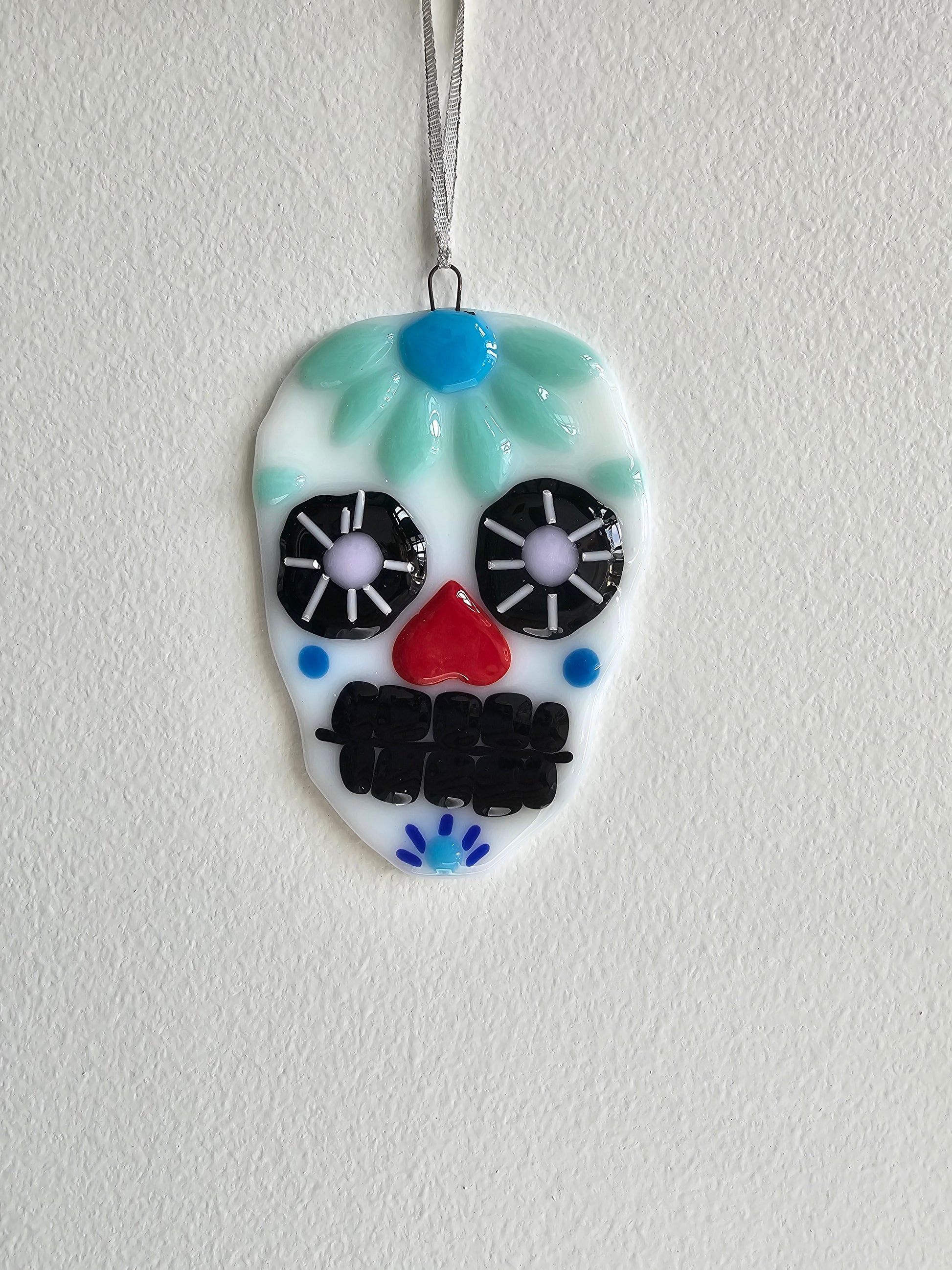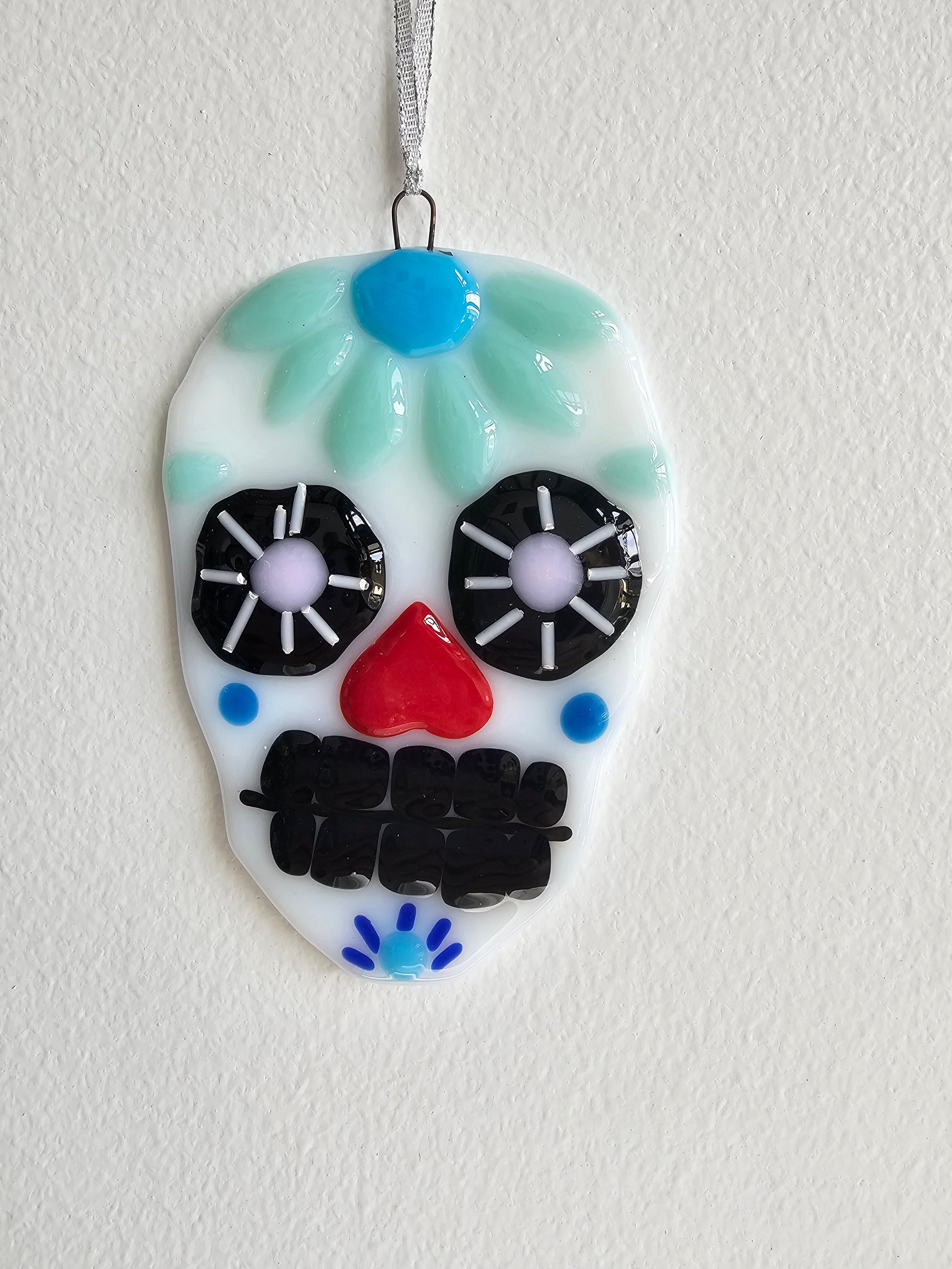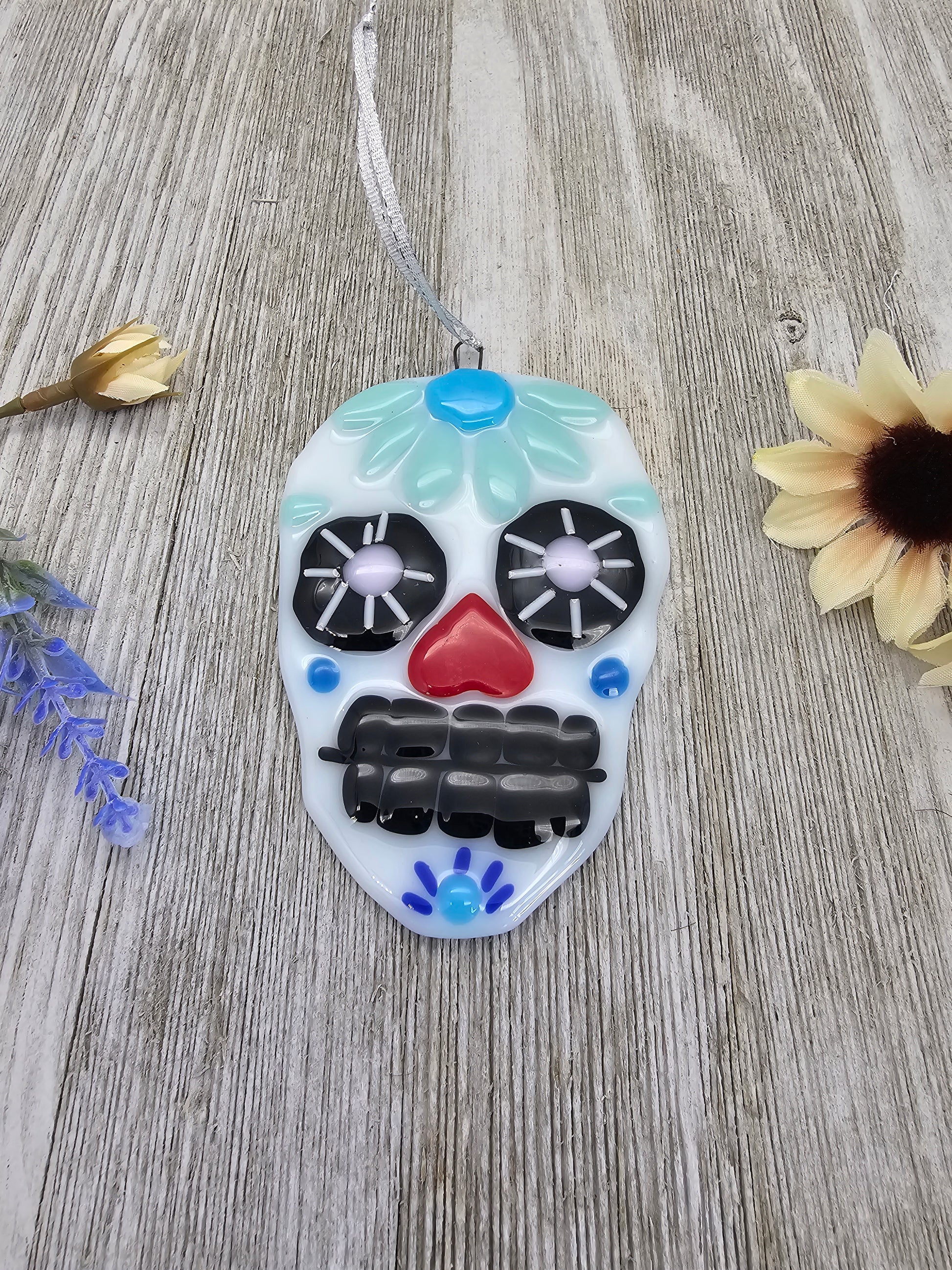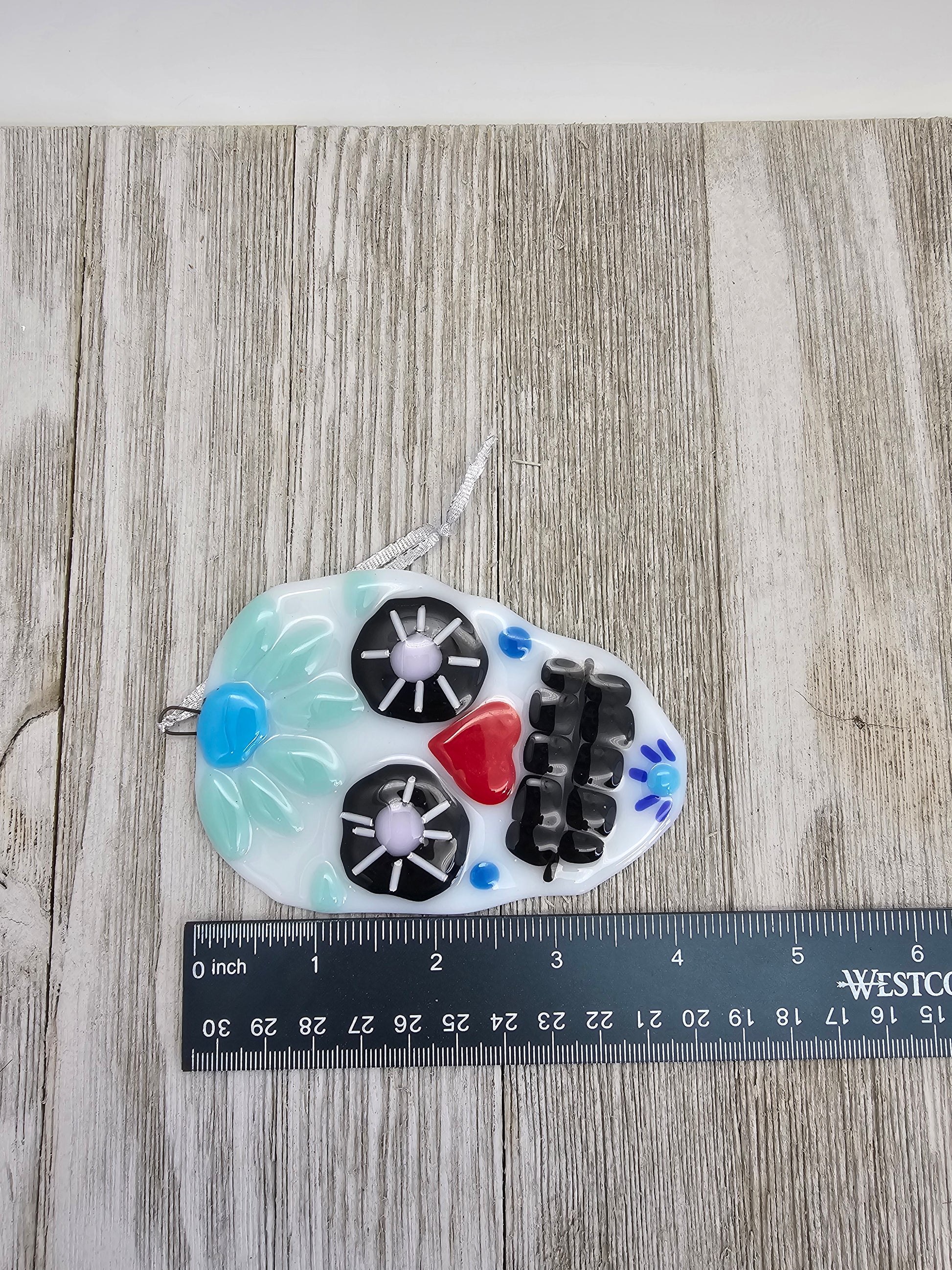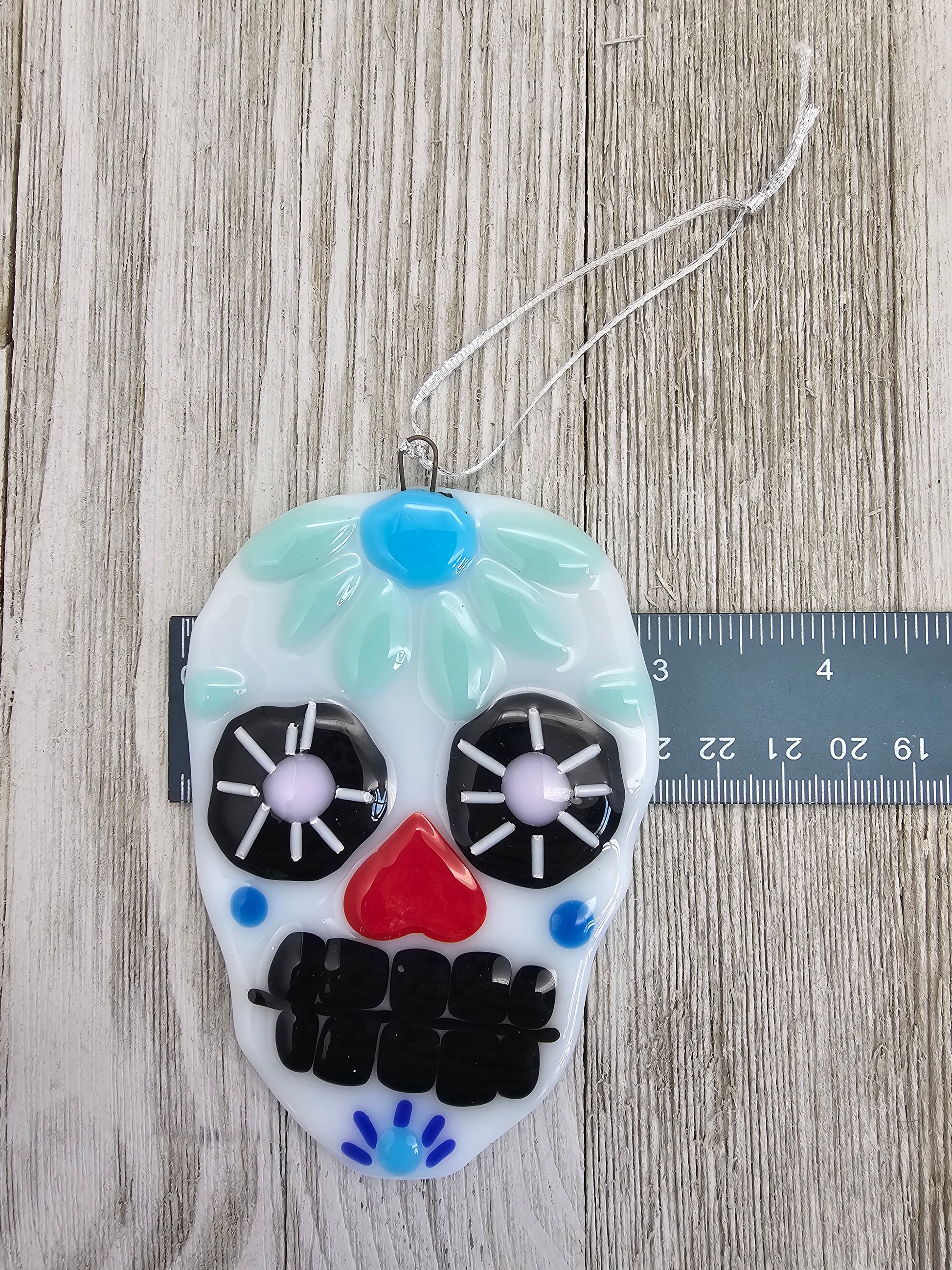 Add some colorful and festive flair to your home with this fused glass sugar skull ornament. This ornament is handmade from glass and features a vibrant design with hand painted elements. This ornament is perfect for hanging on your wall, window, or tree, or as a gift for someone special. Each ornament is unique and may vary slightly in size, shape, and color. The ornament measures approximately 3 inches by 4 inches and comes with a ribbon for easy hanging. Get yours today!