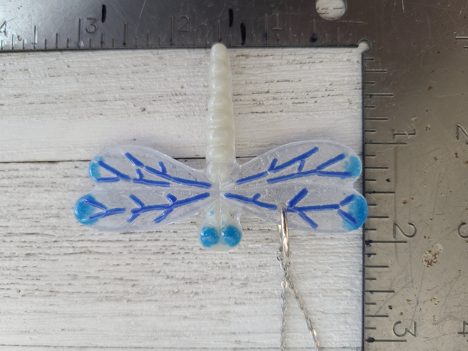 This solid glass dragonfly pendant measures approximately 2" by 3" and hangs on the diagonal. Each dragonfly has a drilled hole that has a hoop through it to hang from. this dragonfly could also be used as a simple suncatcher when not being worn.