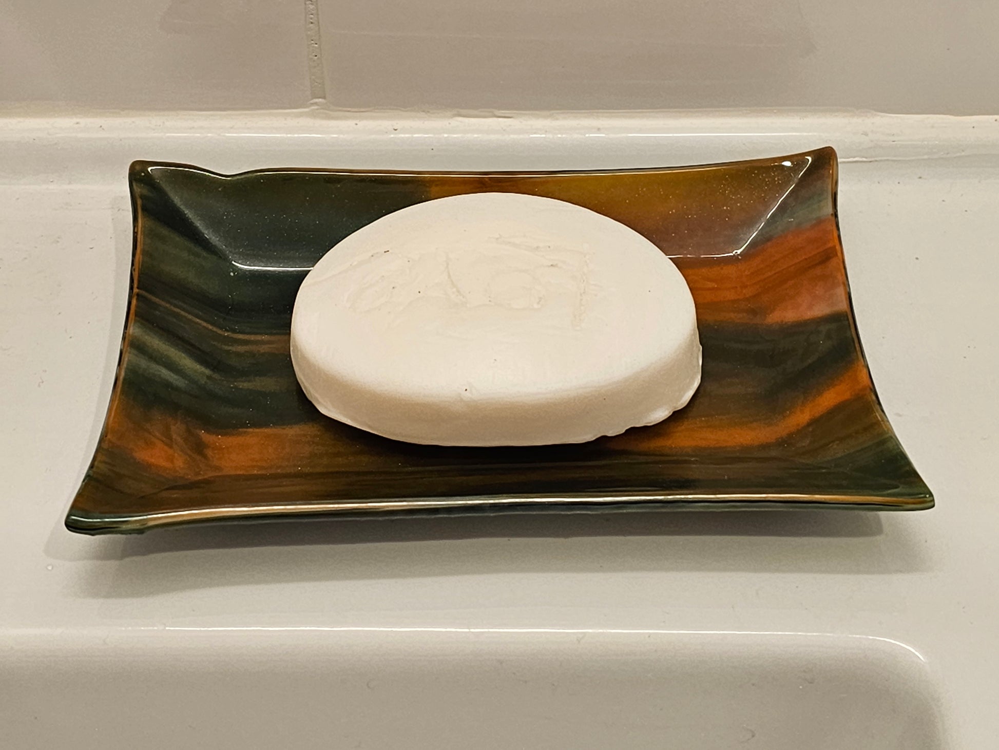 This fused glass dish is made of an orange and green streaky glass that creates a vibrant and modern look. It measures approximately 6 in x 4 in and fits any bar of soap. It can also be used as a candle holder, a ring holder, a trinket dish, or displayed as an art piece. This dish is easy to clean and makes a great design addition to your room.