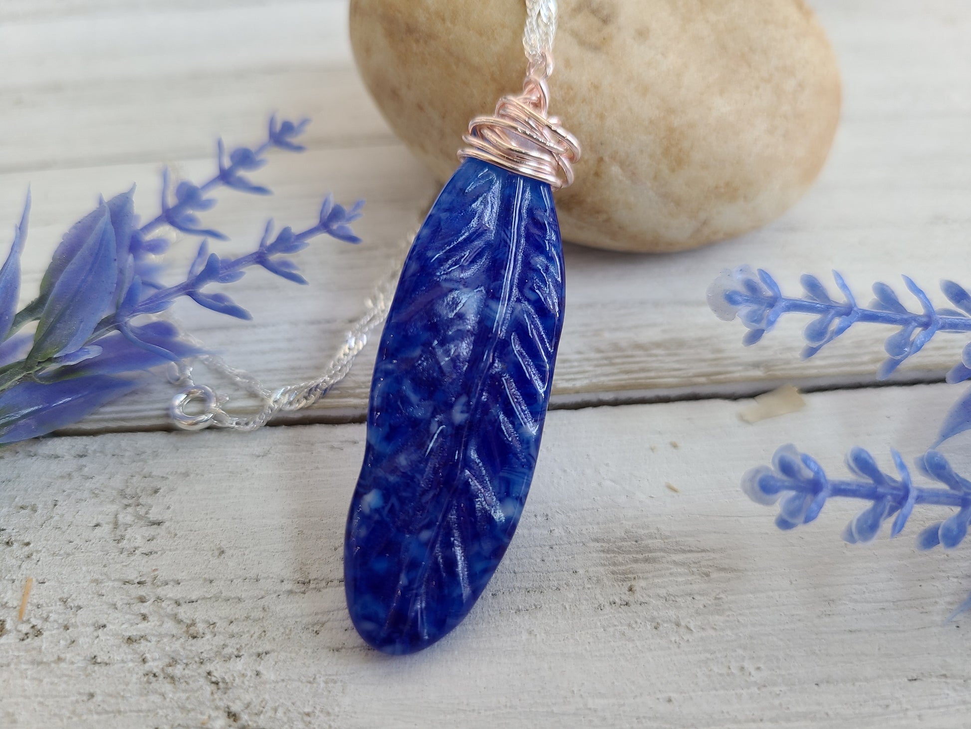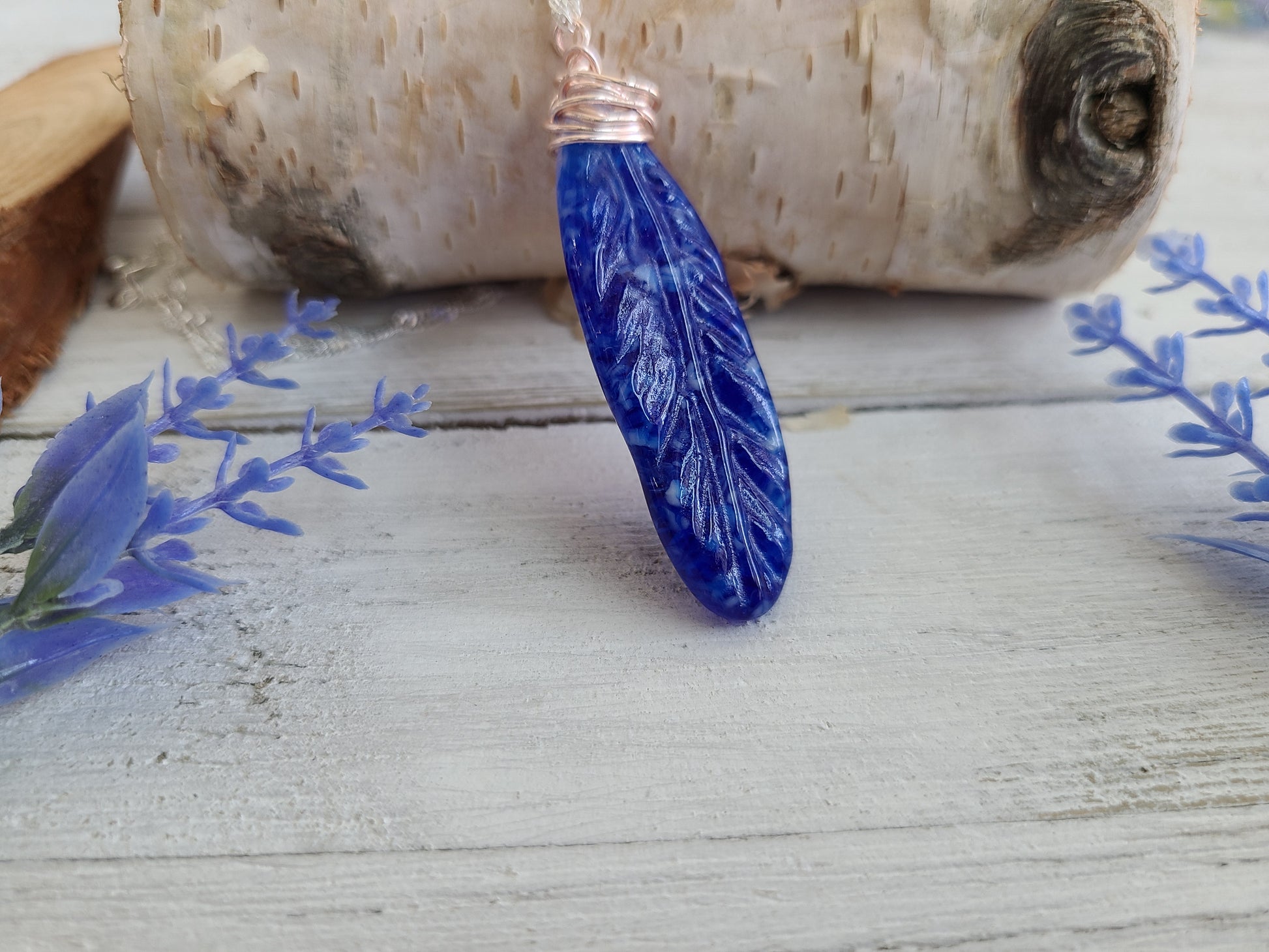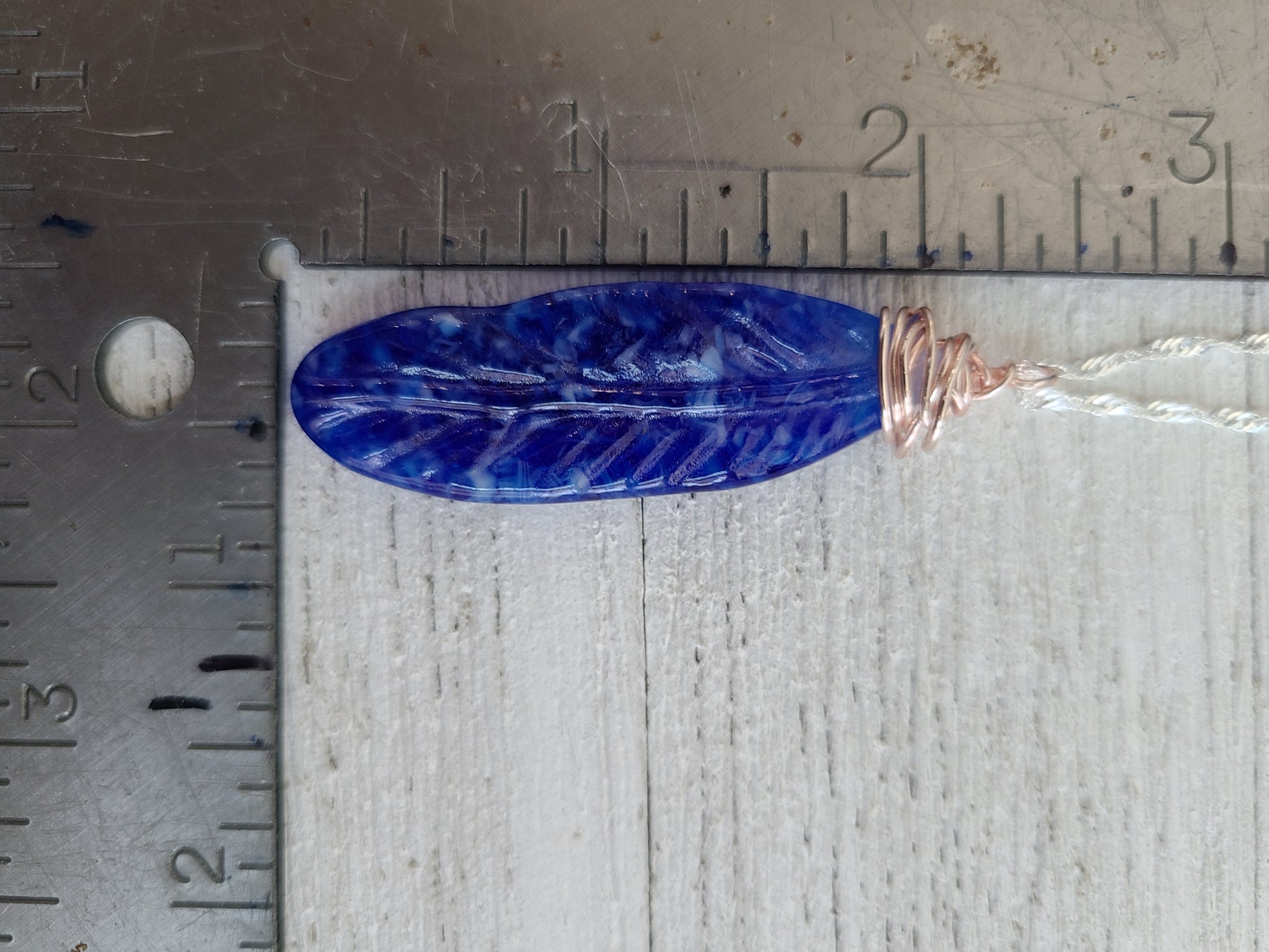 Fused Glass blue and white feather necklace pendant, measures approximately 2" by .75" excluding hoop.