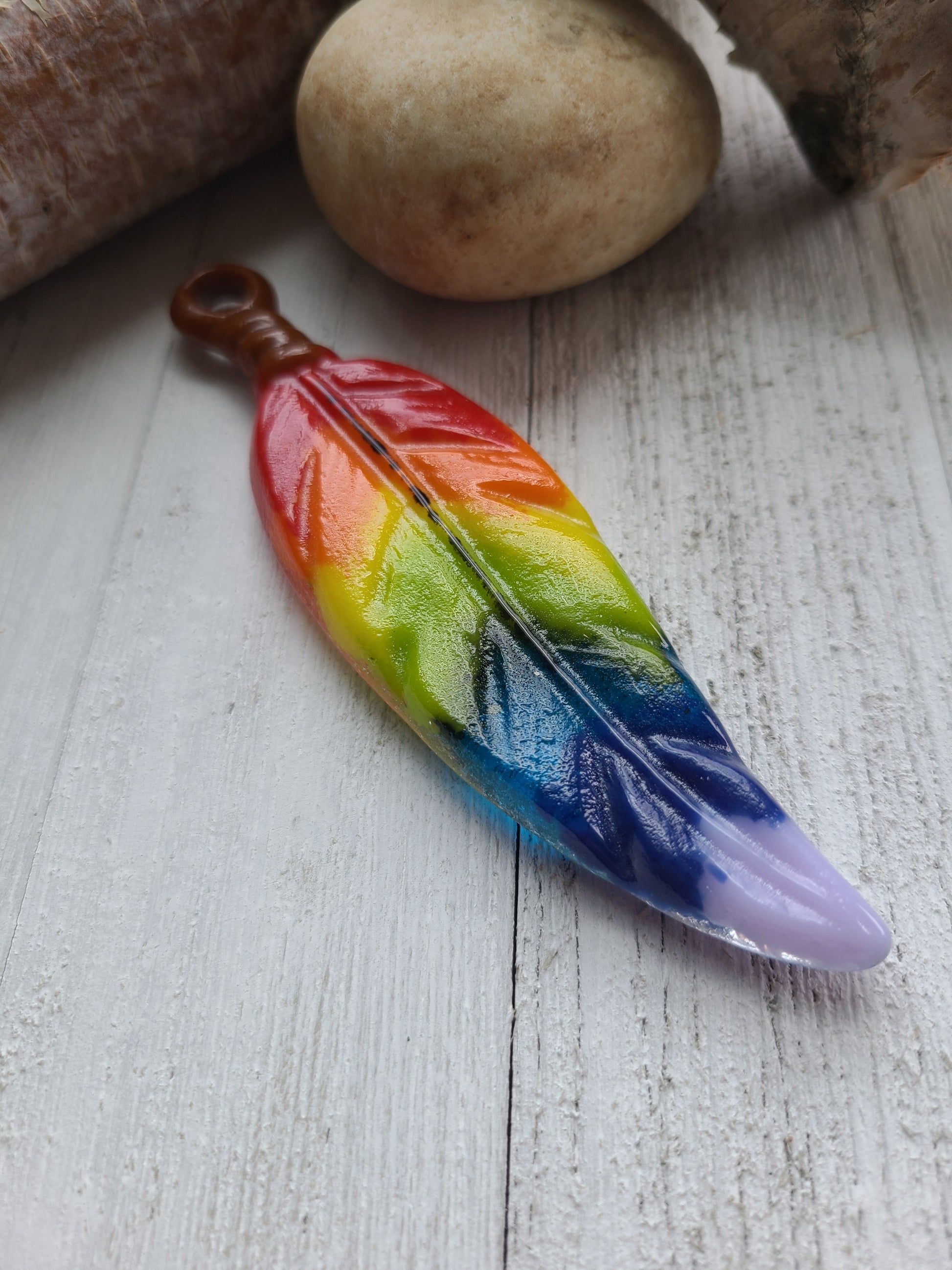 This listing is for one random fused glass feather, you choose the general colorway. This fused glass feather can be used as an ornament or even a necklace pendant. This feather ornament would be a great gift for anyone or a splurge for your own joy.