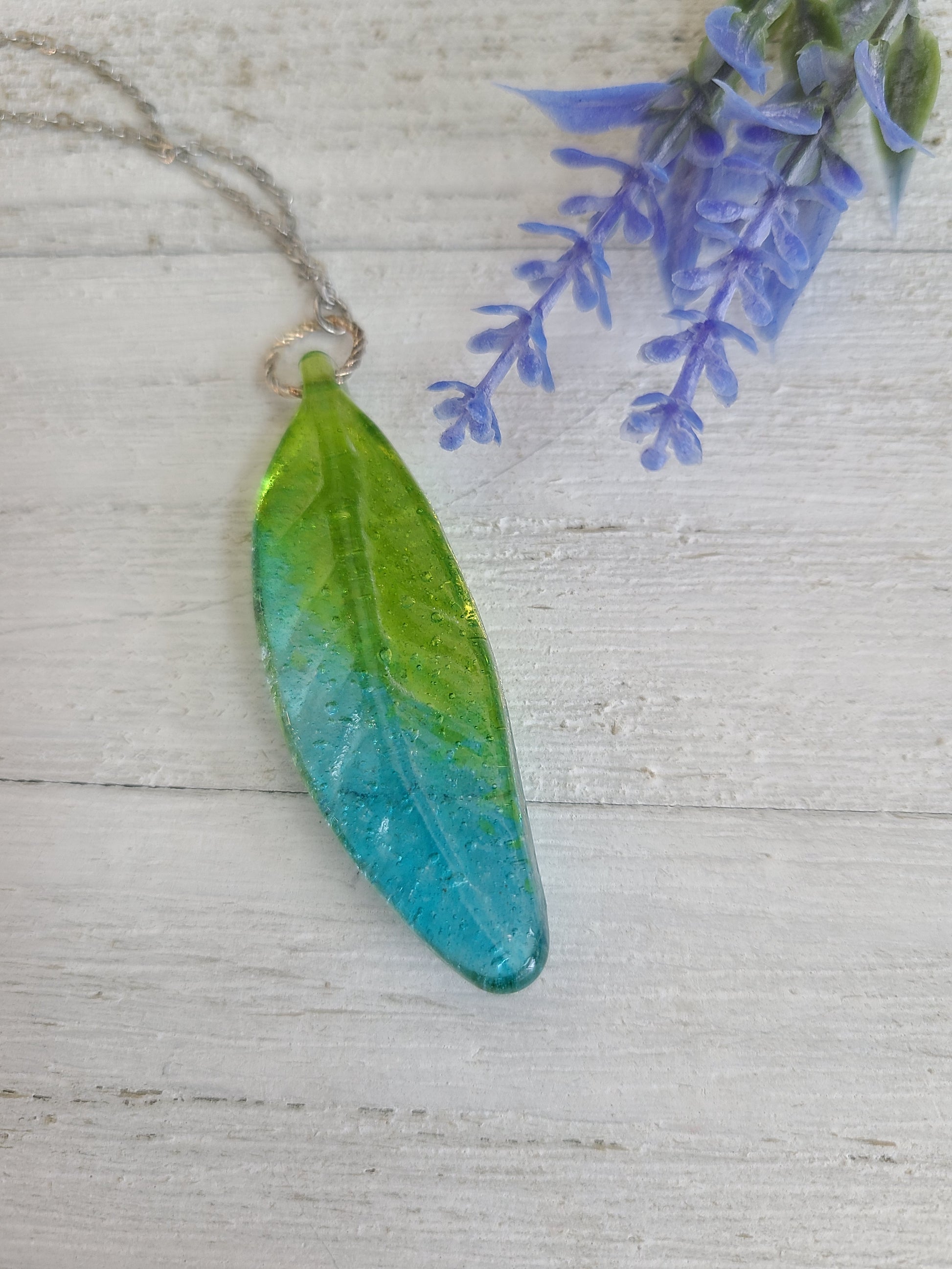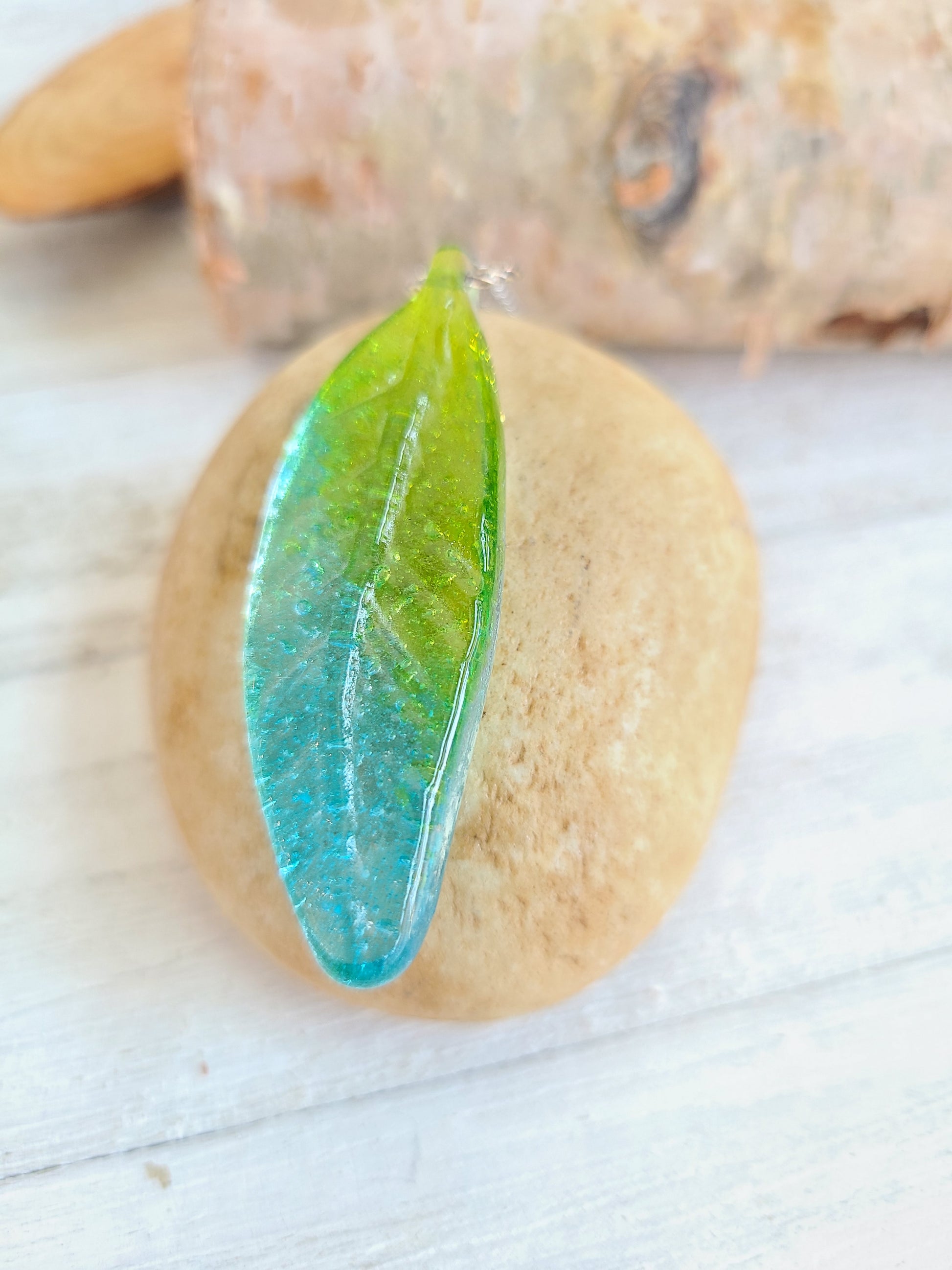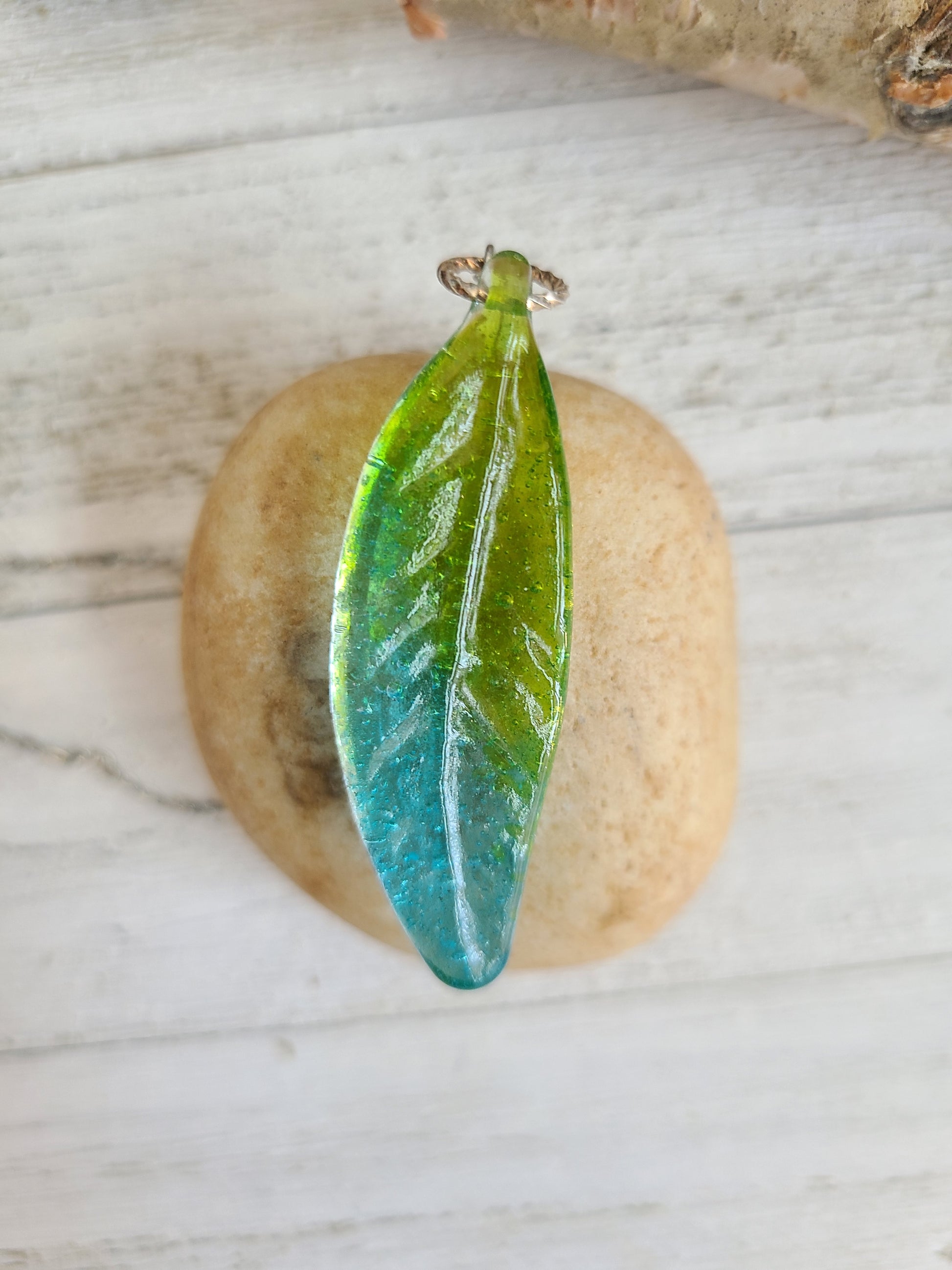Fused glass feather pendant, transparent blue and green. These pendant measures approximately 2.25" by .75" excluding the hoop/hanger.