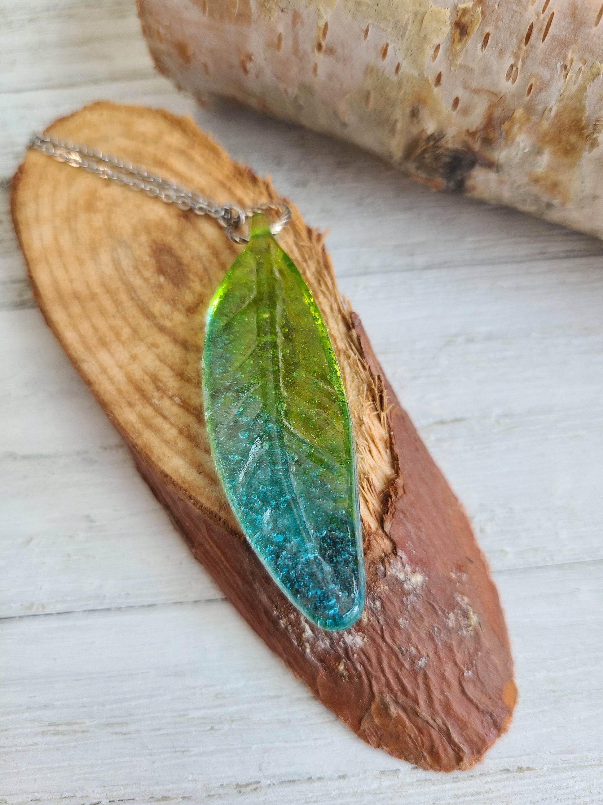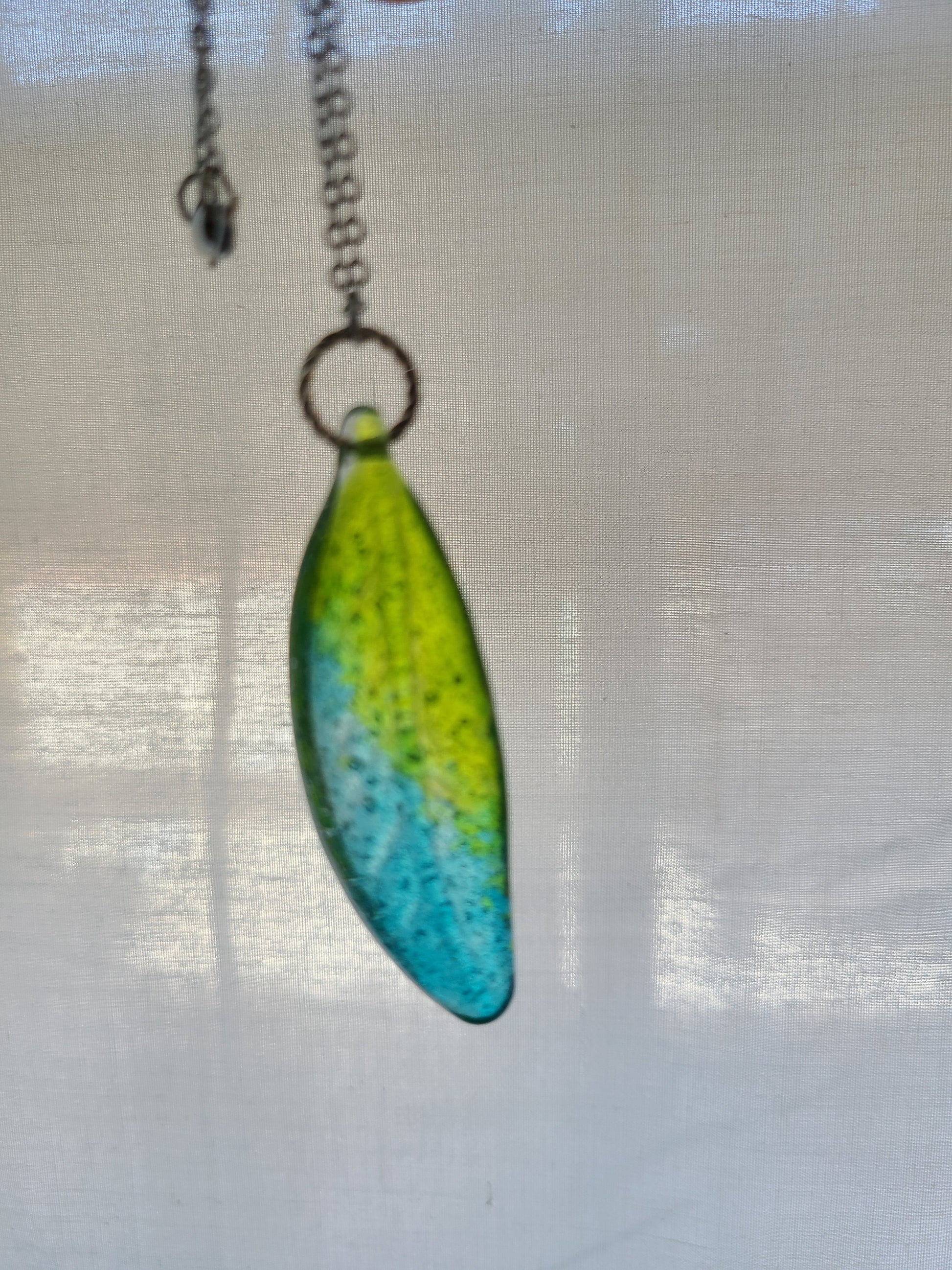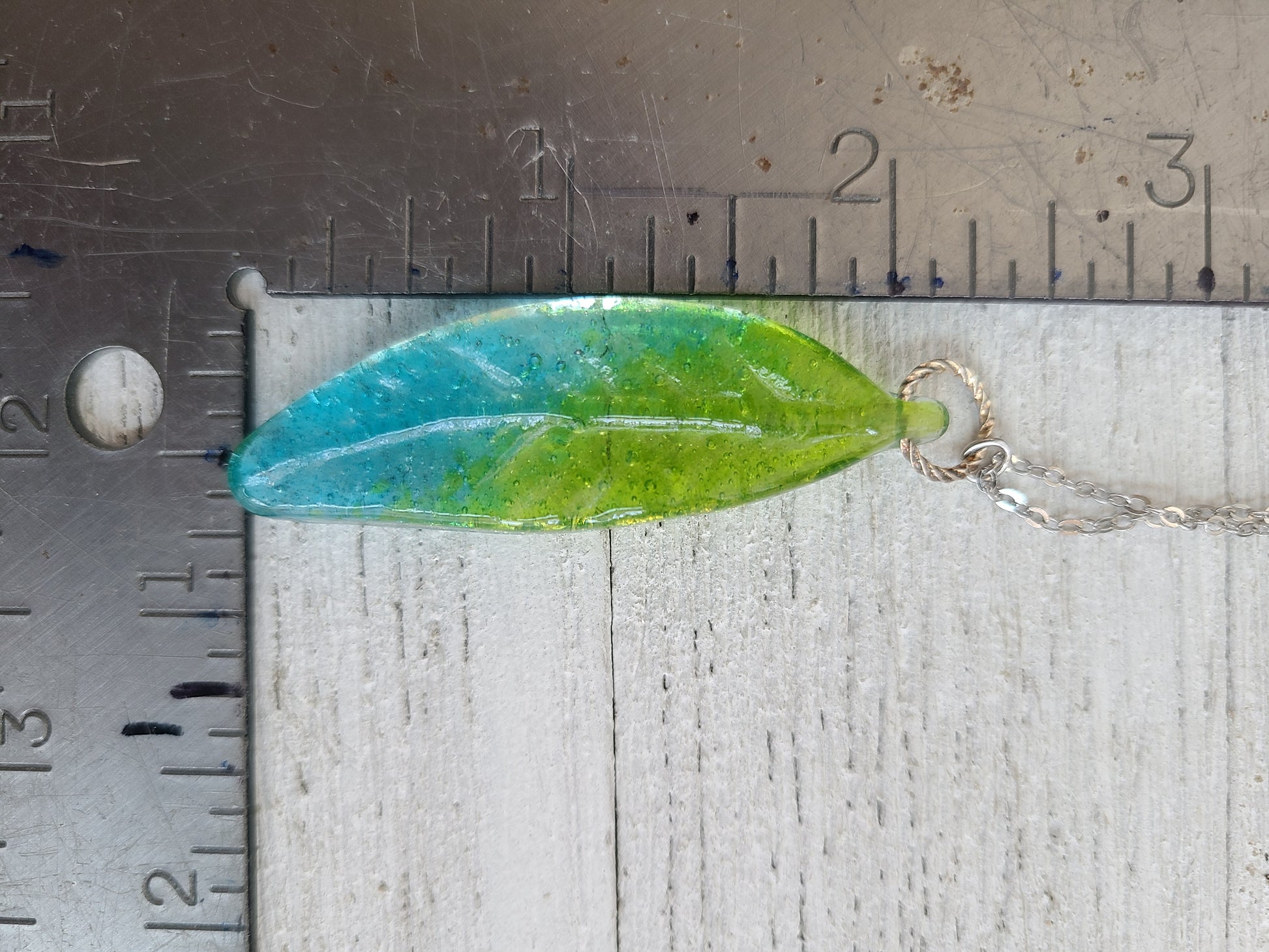 Fused glass feather pendant, transparent blue and green. These pendant measures approximately 2.25" by .75" excluding the hoop/hanger.