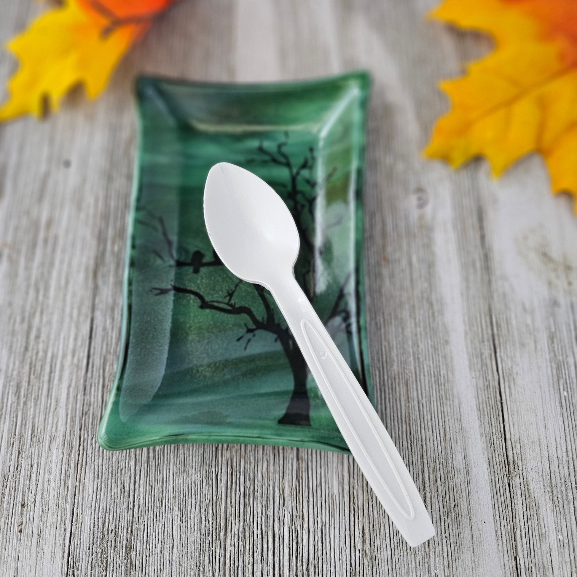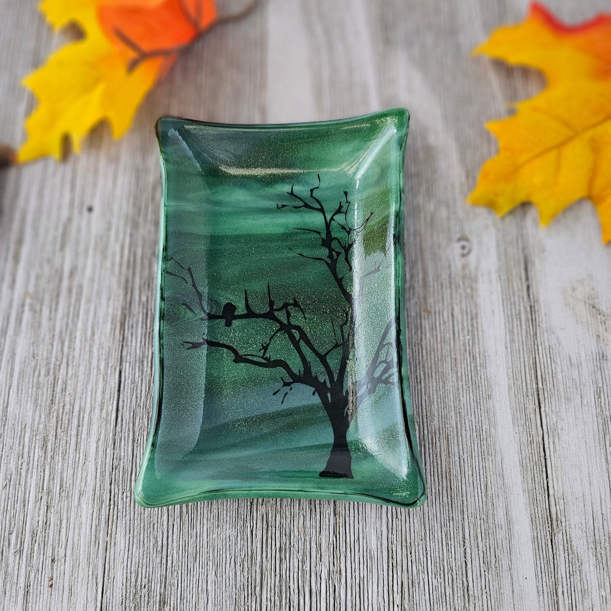Handmade Fused Glass Dish – Green Streaky Glass - Bird and Tree🌿