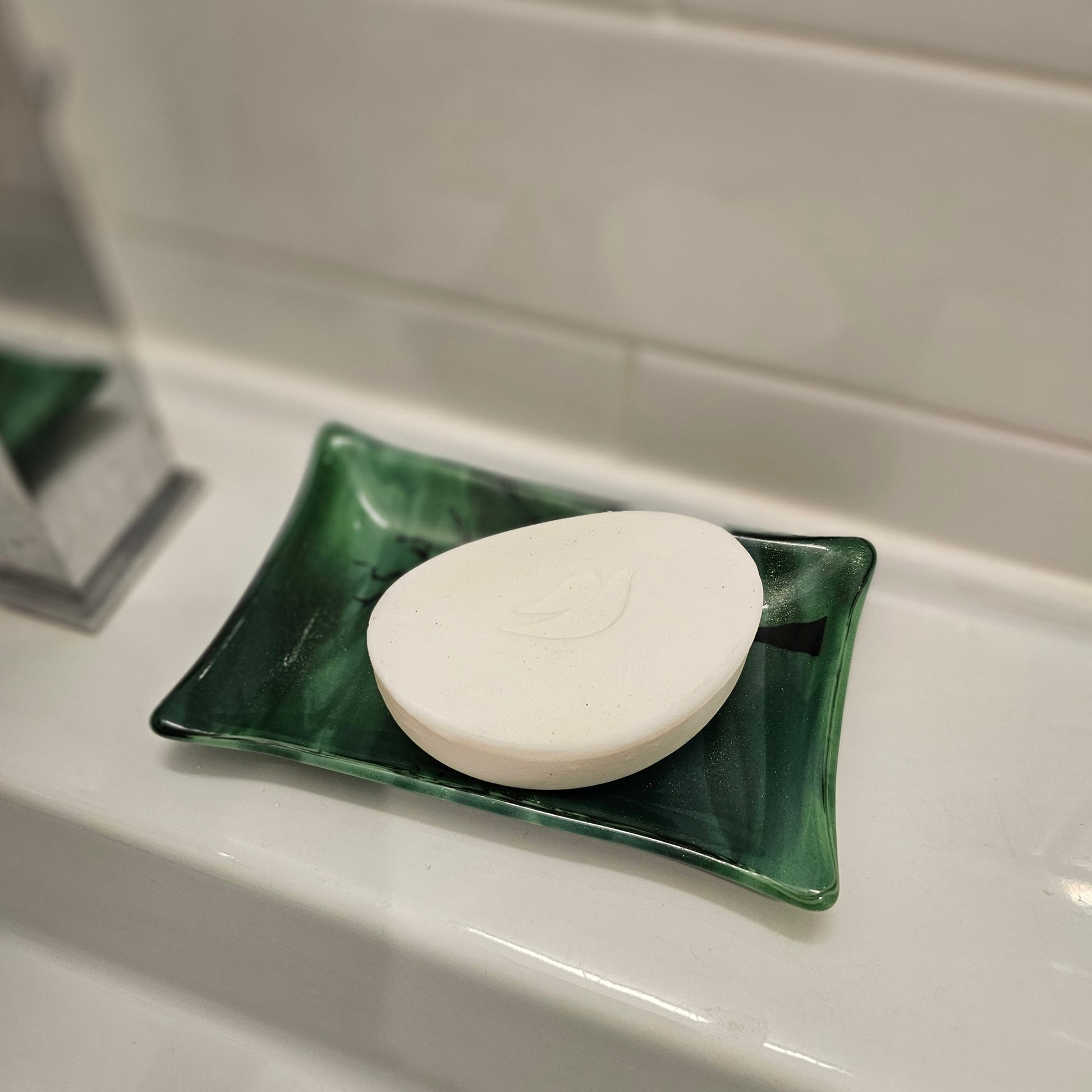 Add a touch of modern elegance to your home with this vibrant fused glass dish, made from beautiful green streaky glass. Measuring approximately 6 in x 4 in, it’s perfect for holding a bar of soap, a candle, rings, trinkets, or simply as an art piece to display. This versatile dish is easy to clean and makes a stunning addition to any room.