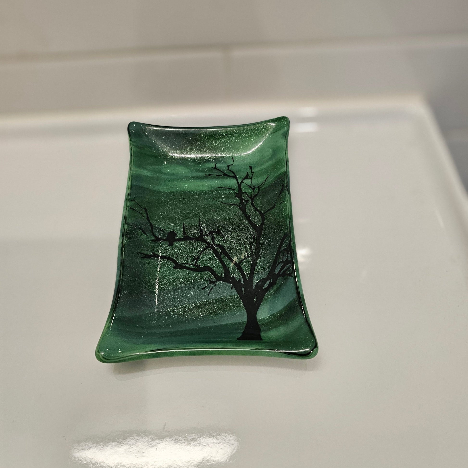 Handmade Fused Glass Dish – Green Streaky Glass - Bird and Tree