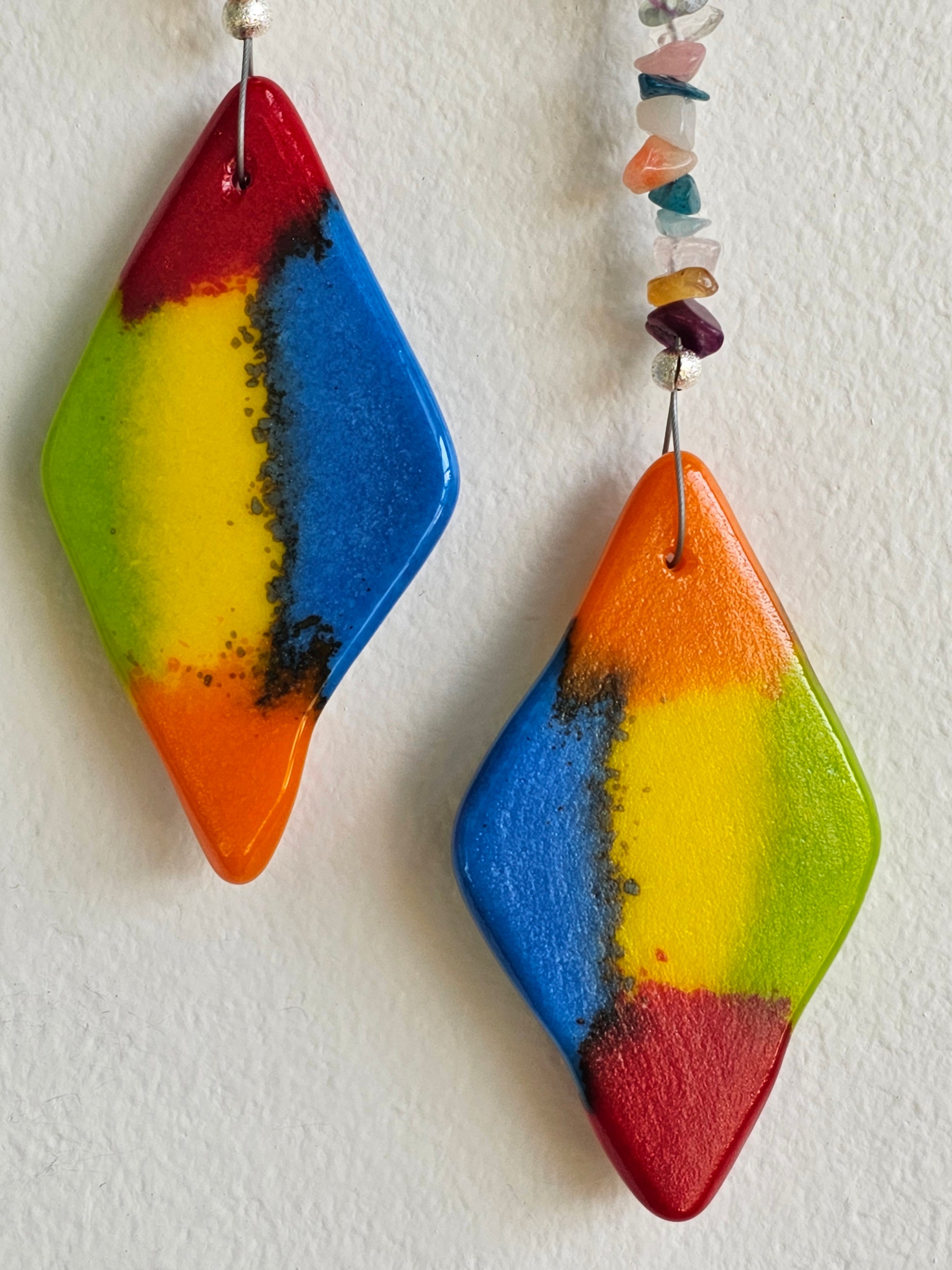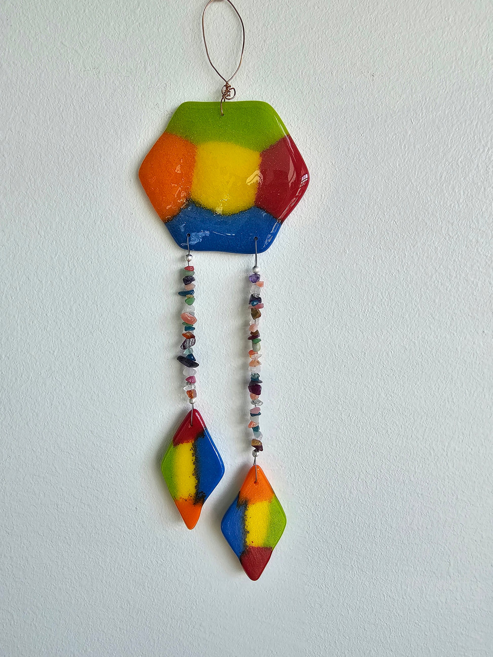 This colorful windchime will bring color and nature to your home. This glass windchime is hexagonal shape with two glass diamond shape dangles. The diamond shaped dangles are held by a coated wire with strung semi-precious stone chips. The colors of this fun and quirky windchime are red, yellow, blue, orange, green and brown from some of the glass reacting to each other. The stones are a mix of agates, quartz, and some jasper.
