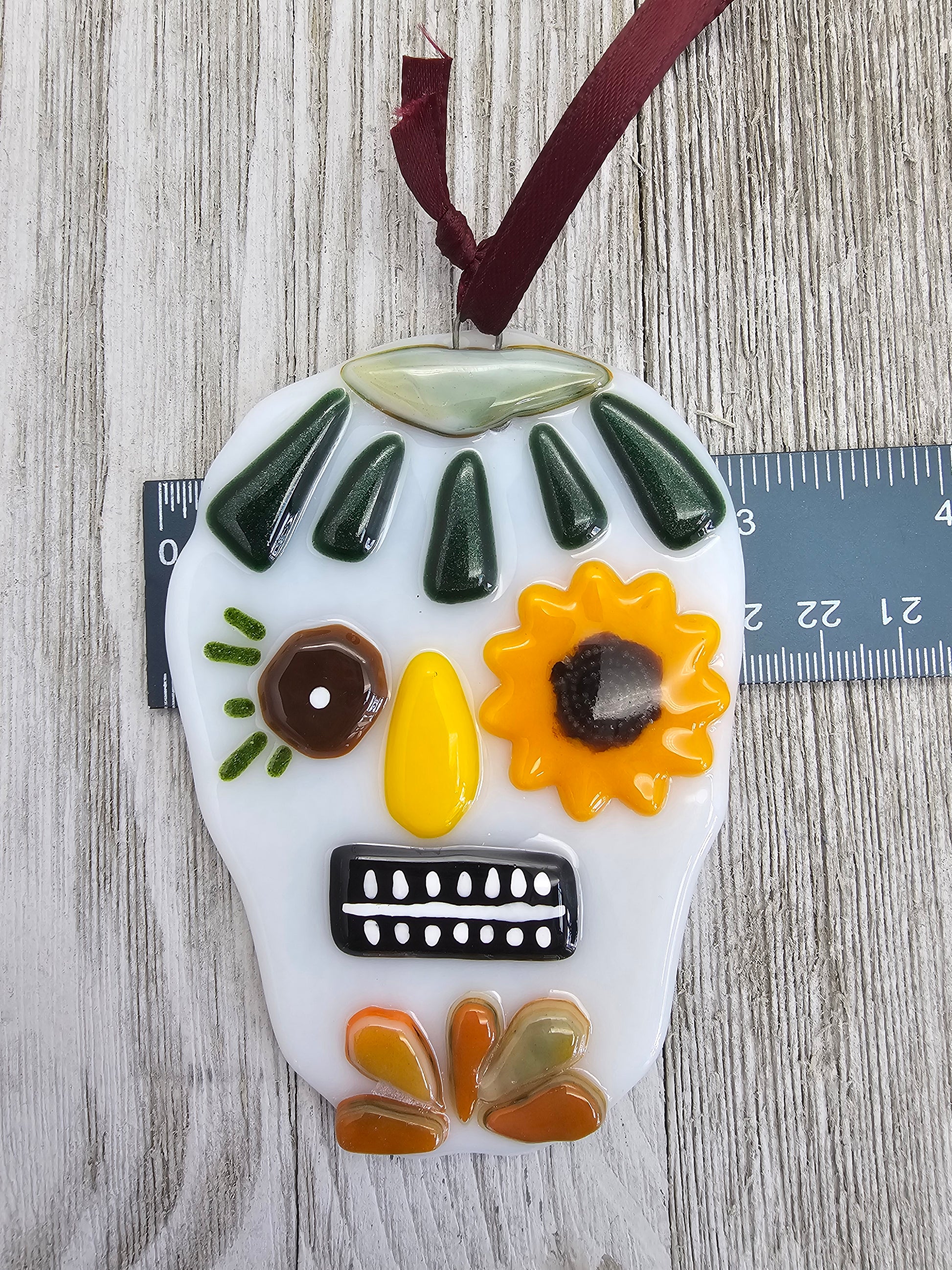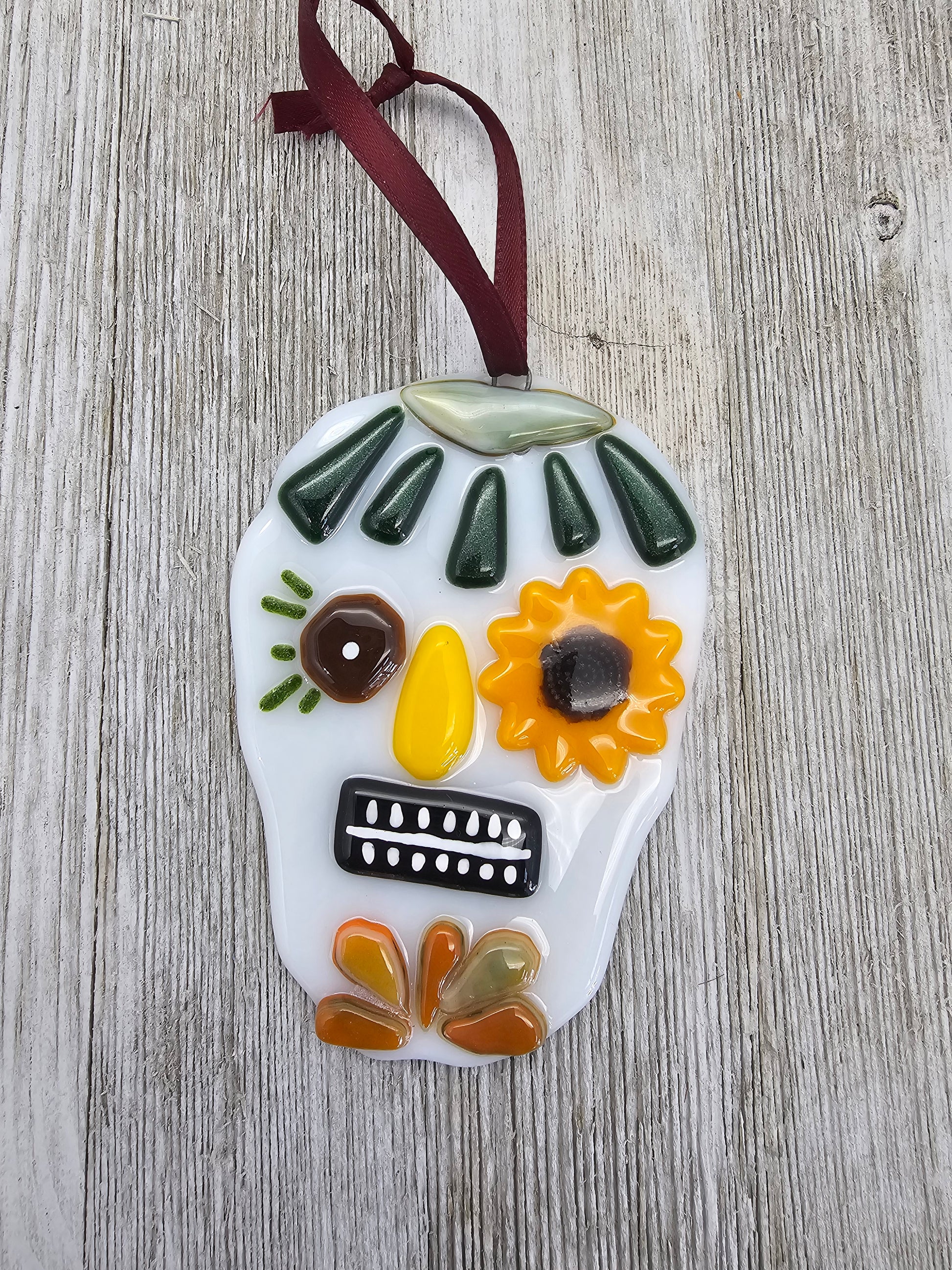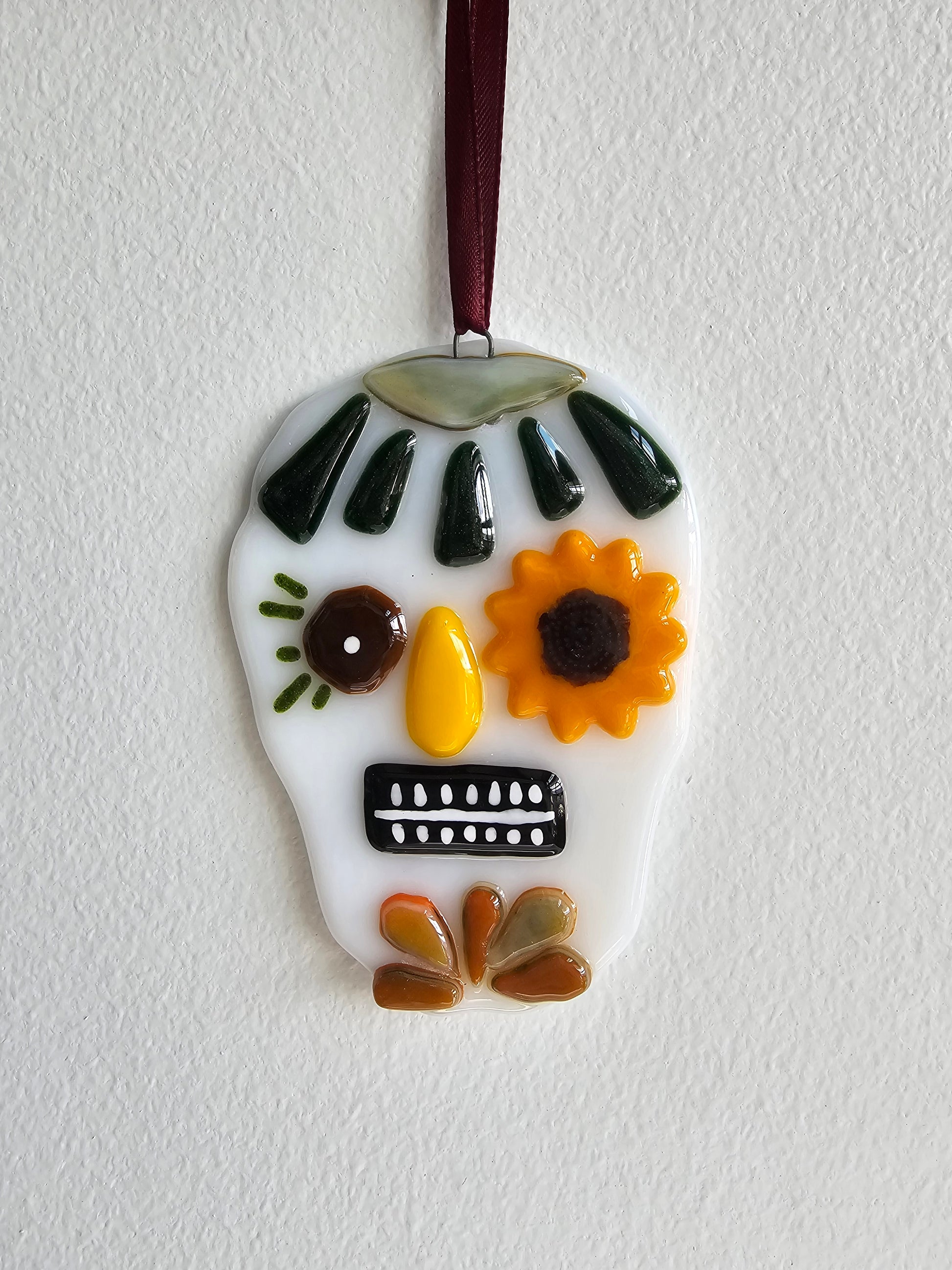 Add some colorful and festive flair to your home with this fused glass sugar skull ornament. This ornament is handmade from glass and features a vibrant design with hand painted elements. This ornament is perfect for hanging on your wall, window, or tree, or as a gift for someone special. Each ornament is unique and may vary slightly in size, shape, and color. The ornament measures approximately 3 inches by 4 inches and comes with a ribbon for easy hanging. Get yours today!