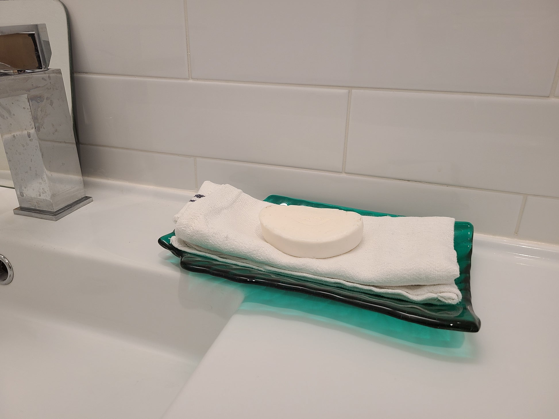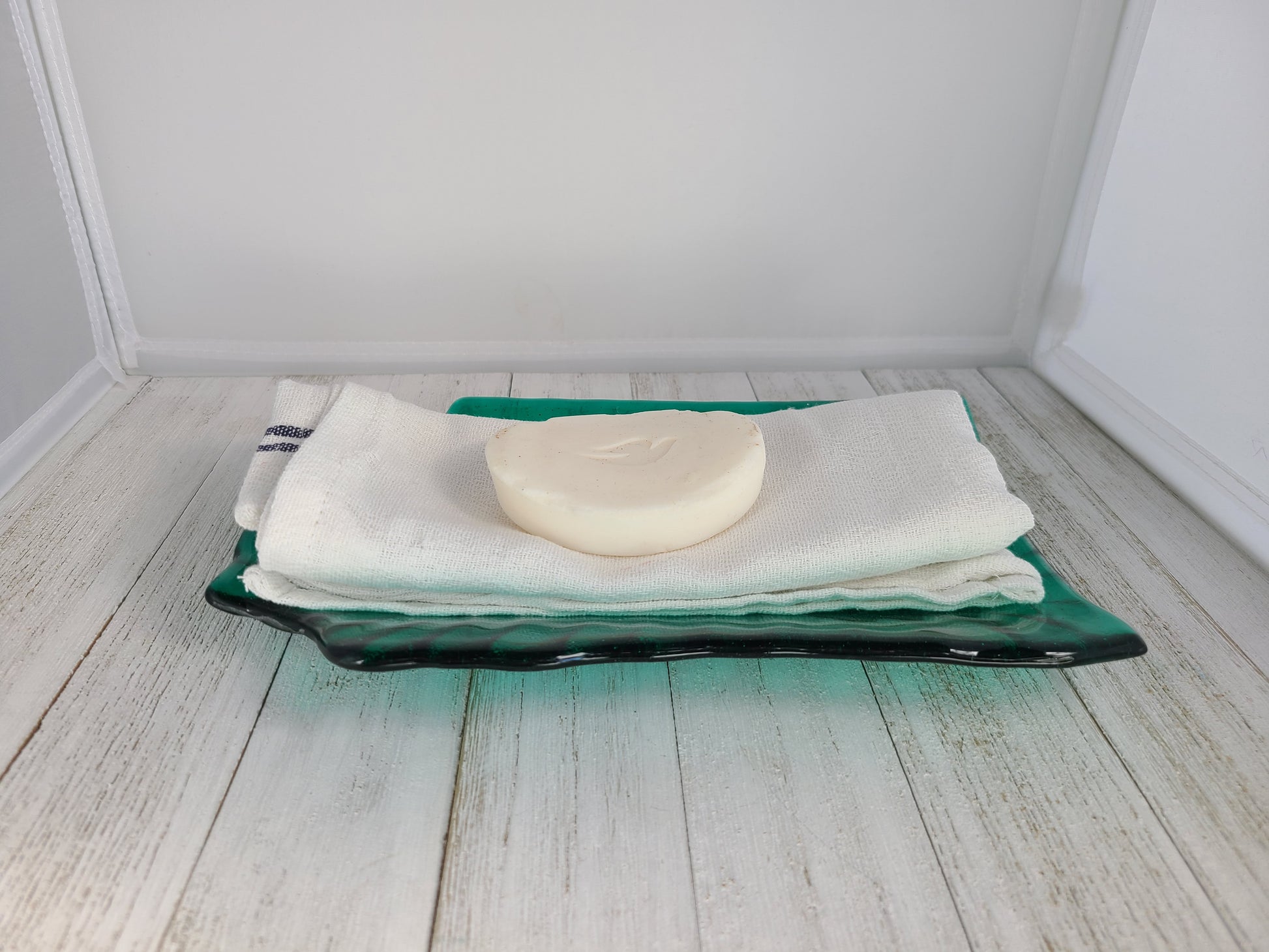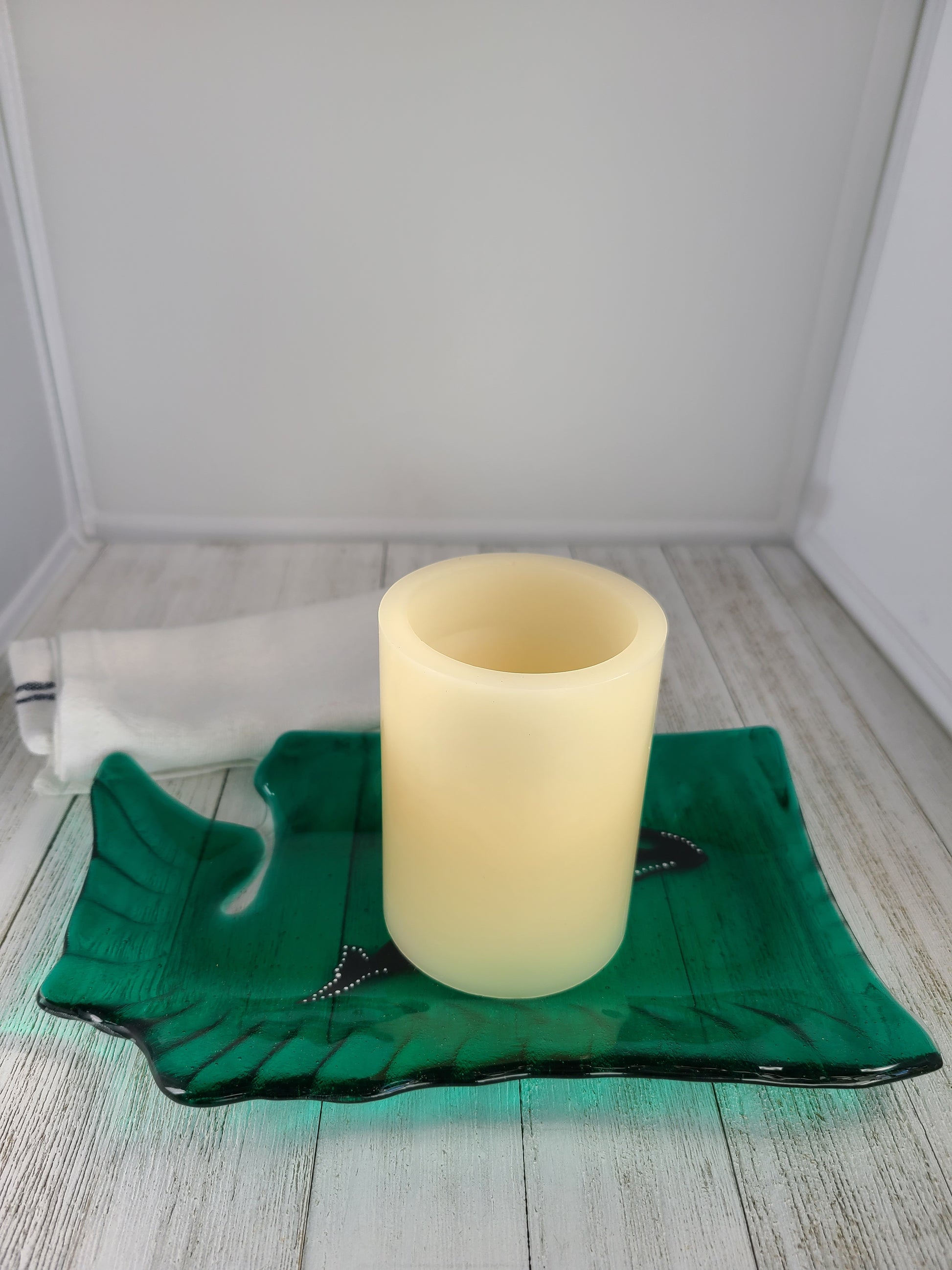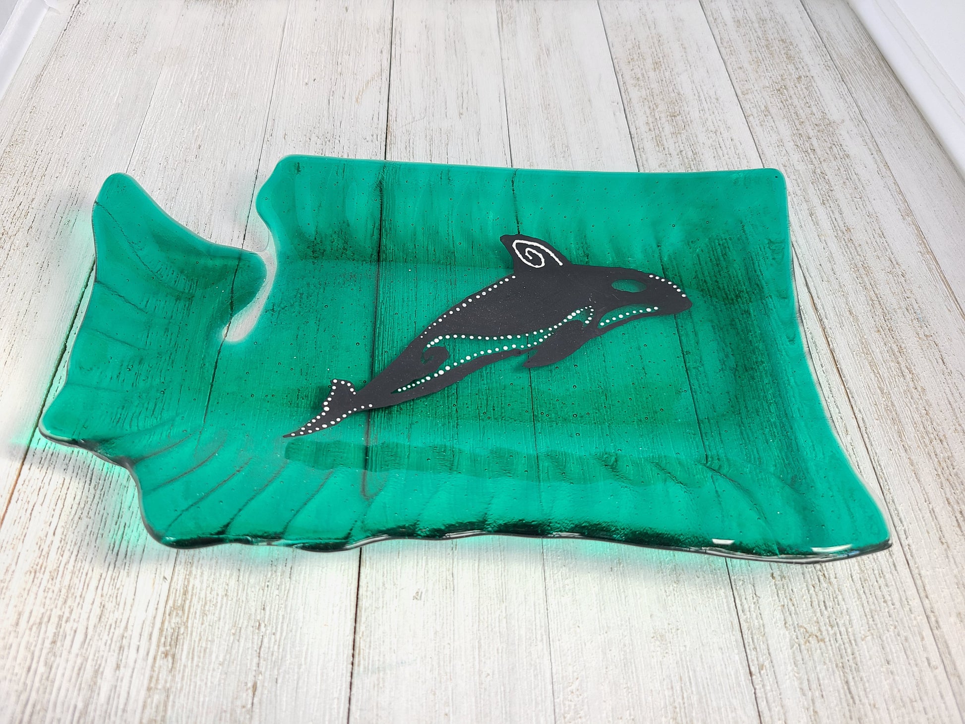 This fused glass bowl was cut in the shape of Washington State. The orca was hand painted with glass enamels and fused together, so it is part of the glass and won't fade or scratch.